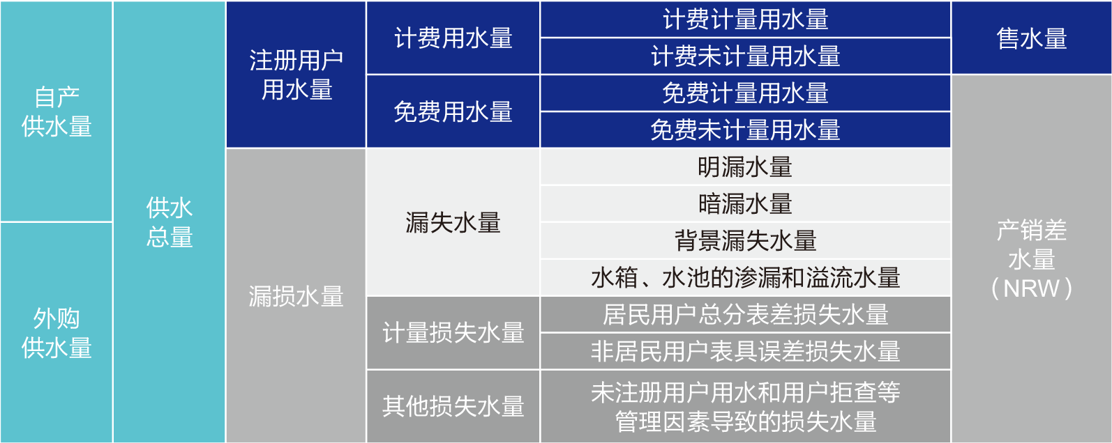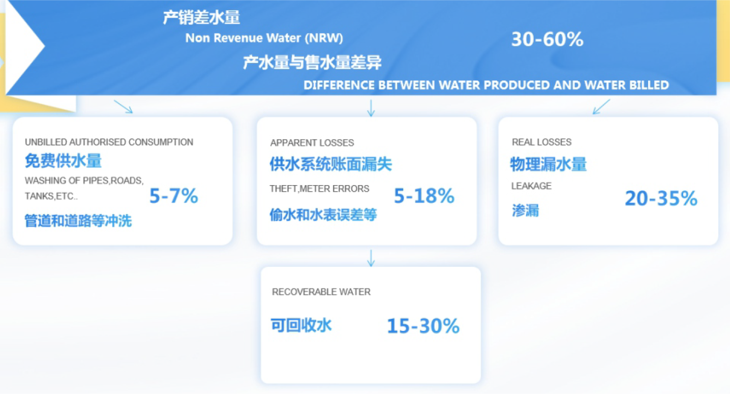 產(chǎn)銷差水量 = 免費(fèi)供水量+物理漏水量+帳面漏水量